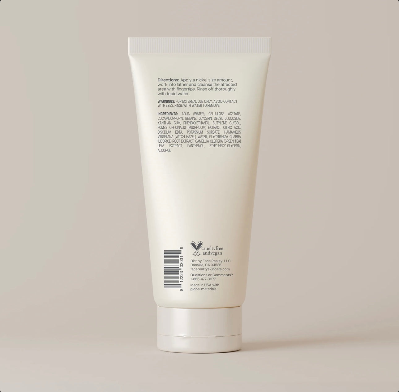 Aqua (Water), Cellulose Acetate, Cocamidopropyl Betaine, Glycerin, Decyl Glucoside, Xanthan Gum, Phenoxyethanol, Butylene Glycol, Fomes Officinalis (Mushroom) Extract, Citric Acid, Disodium EDTA, Potassium Sorbate, Hamamelis Virginiana (Witch Hazel) Water, Glycyrrhiza Glabra (Licorice) Root Extract, Camellia Oleifera (Green Tea) Leaf Extract, Panthenol (D), Ethylhexylglycerin, Alcohol